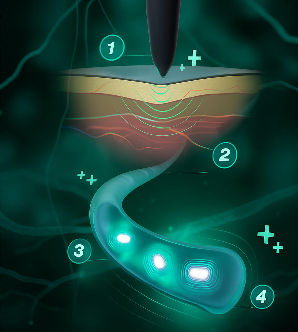 An electrical stimulation delivered from the Stimpod probe travels through the layers of the skin and stimulates peripheral nerves.